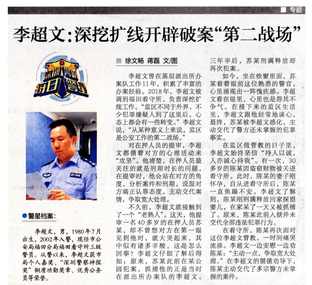 李超文曾在基層派出所辦案隊工作11年,積累了豐富的辦案經(jīng)驗。2018年,李超文被調(diào)到福田看守所,負責(zé)深挖擴線工作?!氨O(jiān)區(qū)不同于外界,不少犯罪嫌疑人到了這里后,心態(tài)上都會有一些轉(zhuǎn)變。”李超文說,“從某種意義上來說,監(jiān)區(qū)是公安工作的第二戰(zhàn)場?!?/p>
