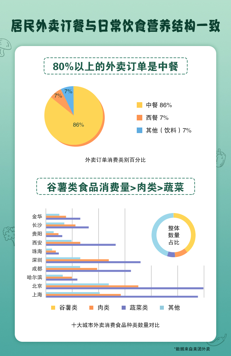 《我國10城市高頻外賣消費菜品膳食結(jié)構(gòu)分析》報告研究指出十城市Top50消費菜品中,排第一的均為米飯,深圳居民對米飯及米制品的喜愛全國排名第一;十城中,油條在所有城市都進入了Top50;深圳和上海市民早餐最愛油條;珠海、哈爾濱居民尤其偏愛肉類食品,在訂制純?nèi)忸愂称返念l次,哈爾濱城市排名最高,谷薯類食品對哈爾濱居民的吸引力比全國其他城市低;西安、北京更愛選擇主食和菜肴搭配,北京居民對肉類食物的興趣度比全國其他城市低。此外,整體來看,最受歡迎的肉類是豬肉、雞肉、牛肉,最受歡迎的蔬菜是白菜、包菜、西紅柿。