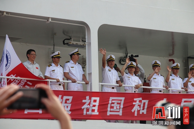 雪龍2號(hào)上的船員和科考隊(duì)員向岸上的送別人群揮手告別,“感謝祖國、感謝深圳!”