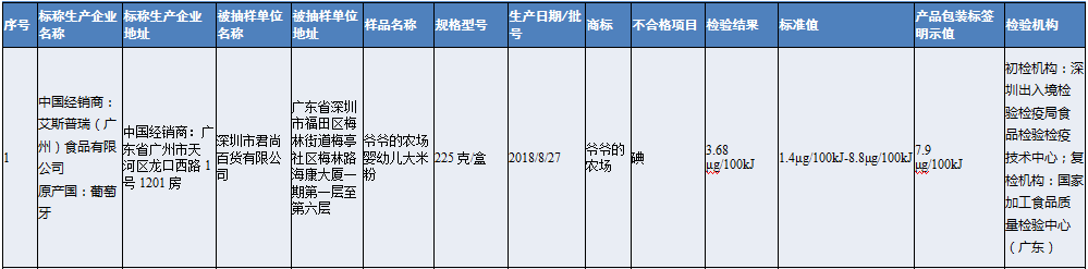 深圳市君尚百貨有限公司銷售的爺爺?shù)霓r(nóng)場嬰幼兒大米粉(原產(chǎn)國:葡萄牙),其中碘檢出值低于產(chǎn)品包裝標(biāo)簽明示值的80%,營養(yǎng)指標(biāo)不達(dá)標(biāo)。