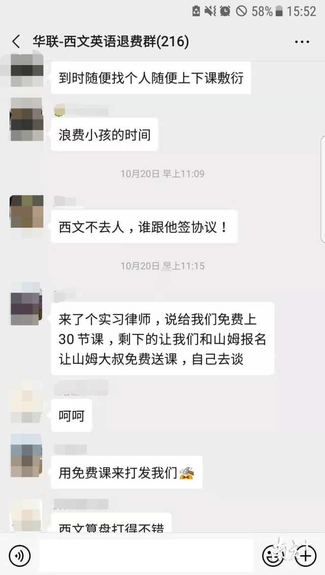 陳先生介紹,消費(fèi)者自發(fā)組建的“華聯(lián)-英語(yǔ)西文退費(fèi)群”里,和他有一樣遭遇的還有215人。每人交學(xué)費(fèi)1-3萬(wàn)不等,按學(xué)費(fèi)2萬(wàn)/人算,涉及學(xué)費(fèi)至少400萬(wàn)元。