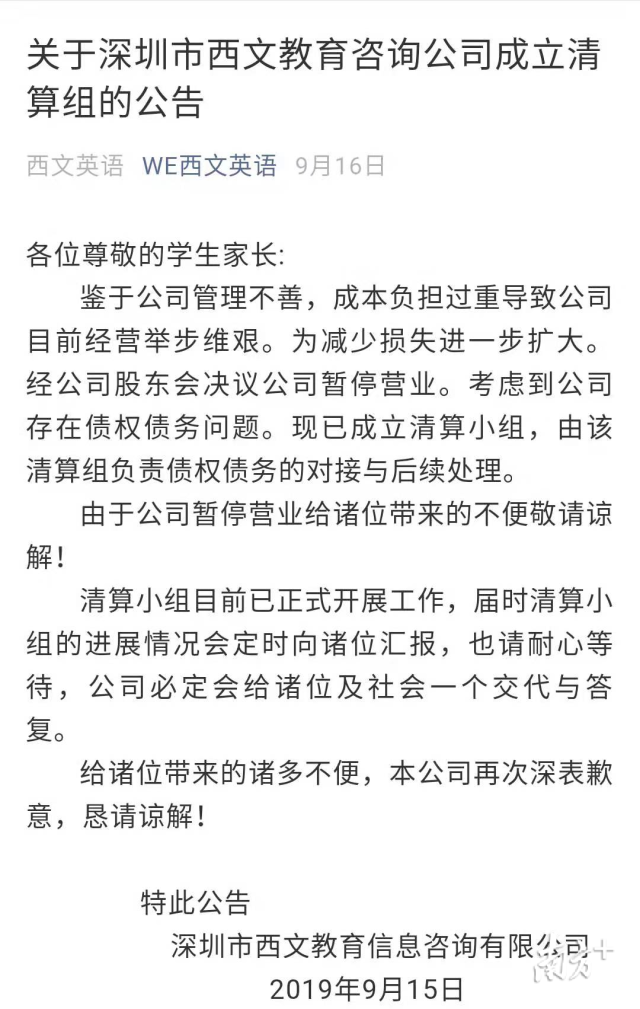 9月19日推文稱“我司全體股東將積極配合政府相關(guān)職能部門(mén)協(xié)調(diào)、解決處理學(xué)生學(xué)費(fèi)的善后事宜,近期我司將制定出妥善的處置方案?!?/p>