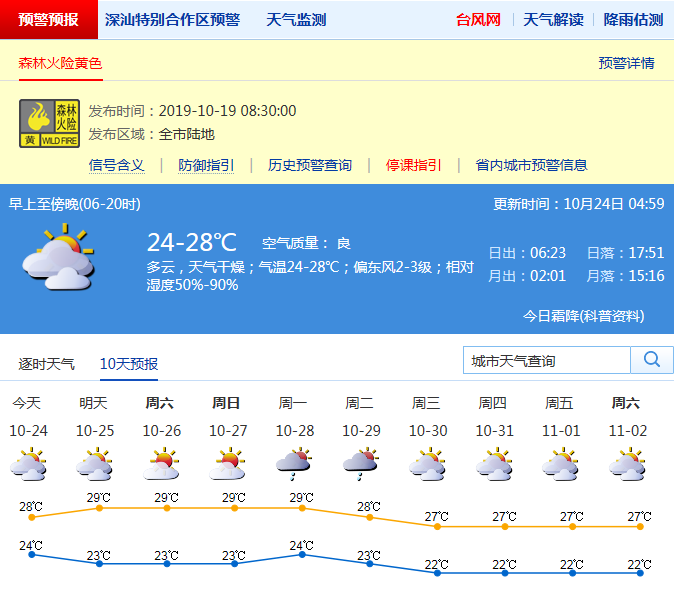 北方因?yàn)榻禍兀藗冊(cè)缫烟咨厦?、穿起秋褲,深圳的小伙伴還在穿著夏裝。昨天白天,全市晴天間多云,早晚較清涼,最低氣溫21℃-23℃,最高氣溫29℃-30℃。全市森林火險(xiǎn)黃色預(yù)警信號(hào)生效中。