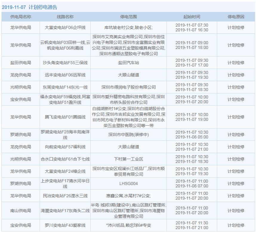 11月1日-15日,深圳這些地方將停電(附全名單)