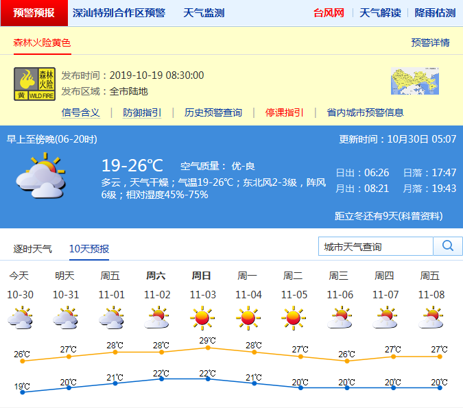 見圳客戶端·深圳新聞網(wǎng)2019年10月30日訊 深圳市氣象局預計30-31日多云間晴天,空氣干燥,氣溫19-26℃,早晚較涼;受冷空氣和熱帶低壓共同影響,30-31日沿海、高地和海區(qū)陣風6-7級。11月1-5日晴天間多云,晝夜溫差加大,空氣持續(xù)干燥。