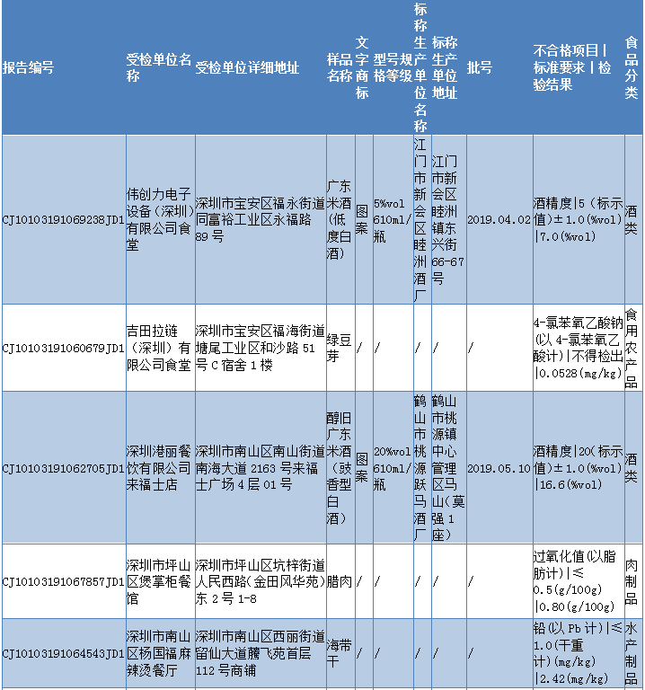 見(jiàn)圳客戶(hù)端 ·深圳新聞網(wǎng)2019年11月6日訊 11月5日,深圳市市場(chǎng)監(jiān)督管理局發(fā)布2019年第四十期食品安全抽樣檢驗(yàn)情況通報(bào),通報(bào)稱(chēng),深圳市市場(chǎng)監(jiān)督管理局于2019年8-9月組織對(duì)我市餐飲環(huán)節(jié)的食品開(kāi)展了抽樣檢驗(yàn)工作,本次共抽檢餐飲環(huán)節(jié)食品671批次,涉及餐飲環(huán)節(jié)經(jīng)營(yíng)主體584家次,共檢測(cè)食品指標(biāo)3385項(xiàng)次。其中檢出不合格樣品12批次,涉及不合格食品類(lèi)別有酒類(lèi)2批次均為米酒;肉制品2批次為臘肉和臘鴨腿;食糖1批次、食用農(nóng)產(chǎn)品5批次牛蛙、豬肝等在列;蔬菜制品1批次、水產(chǎn)制品1批次。