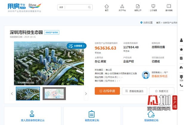 記者在平臺官網(wǎng)看到,平臺不僅提供創(chuàng)新型產(chǎn)業(yè)用房申請入口、平臺專享金融服務(wù)、企業(yè)空間需求申報(bào),還設(shè)有深圳產(chǎn)業(yè)空間地圖、720度全景看房,頁面簡潔直觀。