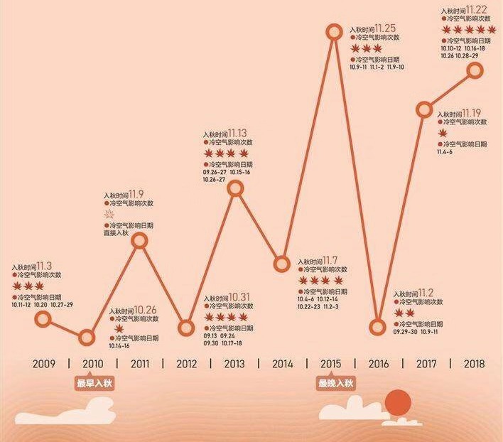 近10年來,深圳入秋的時間有推遲的趨勢。2009年至2018年10年間,最早的入秋時間是2010年10月26日,最晚是2015年11月25日,同時也是深圳歷史上最晚入秋時間。
