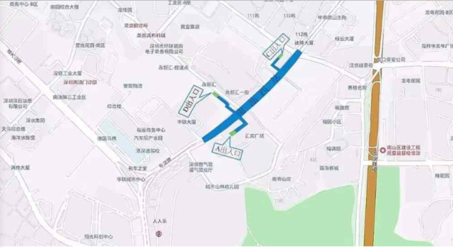 高新南站位于白石路上沿白石路東西向布置,車站出入口共計(jì)4個(gè),其中A、B出入口接科技生態(tài)園,C出口靠豪威科技大廈,D出口通向科技南路方向。