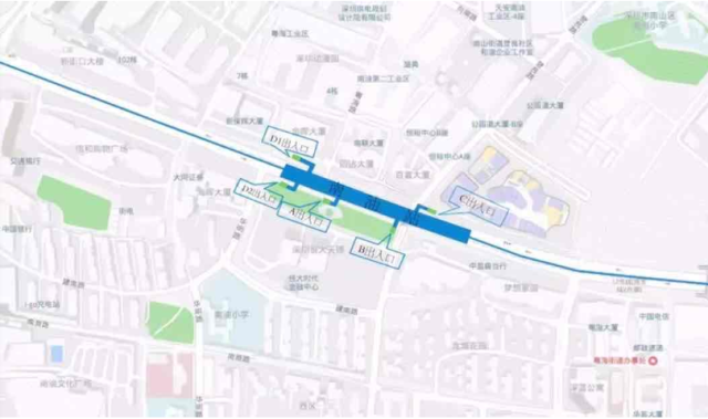 南油站位于南山區(qū)南海大道與登良路交叉口下方,車站出入口共計5個,B出入口位于恒大天璟北側(cè),C出入口位于來福士廣場一側(cè)登良路與南海大道交匯處,D1出入口位于金暉大廈東側(cè),A、D2出入口位于南海大道與華明路交匯處