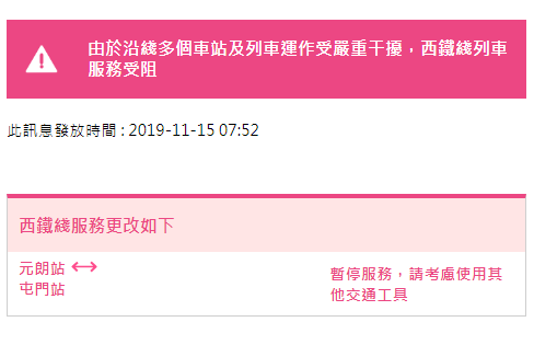 07:52,西鐵線服務更改為:元朗站往返屯門站暫停服務。