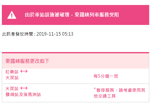 至05:13,港鐵更新信息,由于車站設施被破壞,東鐵線列車受阻,服務安排更改為:火炭到紅磡每5分鐘一班,火炭站至羅湖及落馬洲站暫停服務。