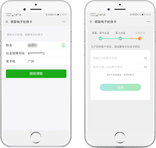 根據(jù)提示授權(quán)領(lǐng)取電子社??ǎ⑦M(jìn)行實(shí)人實(shí)名認(rèn)證后,設(shè)置電子社??艽a,即可完成領(lǐng)取。