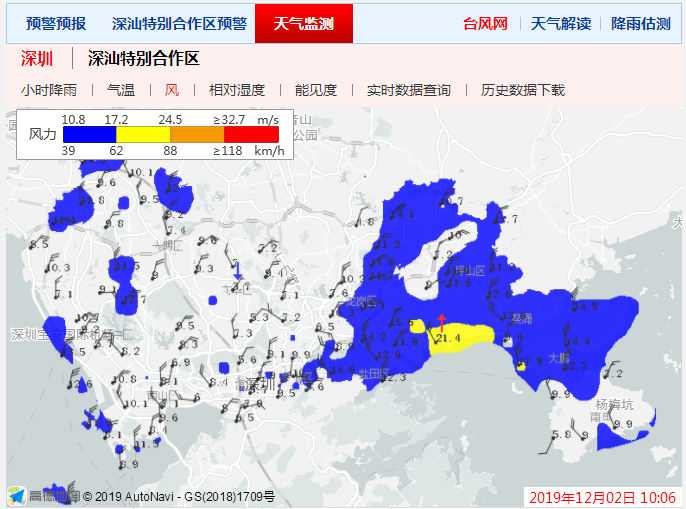 從實(shí)時(shí)的風(fēng)力圖上可以看到,龍崗區(qū)、坪山區(qū)、鹽田區(qū)、大鵬新區(qū)大部風(fēng)力在10.8m/s至17.2m/s,更有部分區(qū)域風(fēng)力達(dá)黃色預(yù)警。