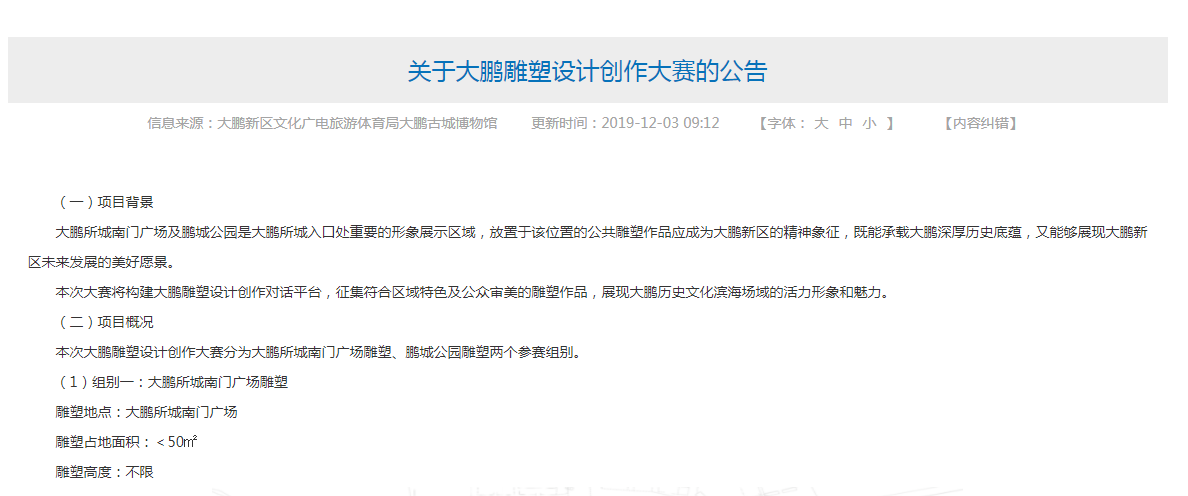 見圳客戶端·深圳新聞網2019年12月3日訊 為了展現(xiàn)大鵬歷史文化濱海場域的活力形象和魅力,12月3日,大鵬新區(qū)文化廣電旅游體育局大鵬古城博物館啟動大鵬雕塑設計創(chuàng)作大賽,征集大鵬所城南門廣場及鵬城公園雕塑作品,參賽不限單位或個人,最終每組作品都將評選出6名獲獎者,單項最高獲4萬元獎金,總獎金22萬元。
