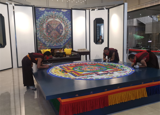 在活動現(xiàn)場,壇城沙畫的現(xiàn)場制作格外引人注目?!耙簧骋皇澜纾蝗~一菩提”——壇城沙畫的過程仿佛一場視覺的盛宴。據(jù)了解,壇城是指對一座宮殿一個世界的泛義,用珍貴珊瑚、瑪瑙、綠松石等礦物質(zhì)研磨成粉,落沙即成畫,畫面立體生動,壇城展示了高度的藝術(shù)魅力和視覺觀感。