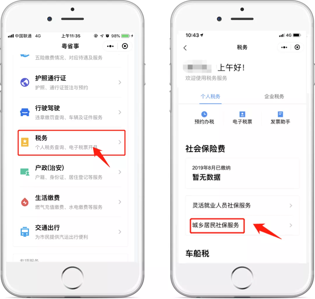 在“粵省事”小程序首頁(yè)點(diǎn)擊“稅務(wù)”服務(wù),在“個(gè)人稅務(wù)”板塊找到“社會(huì)保險(xiǎn)費(fèi)”—“城鄉(xiāng)居民社保服務(wù)”(暫不支持深圳地區(qū))。