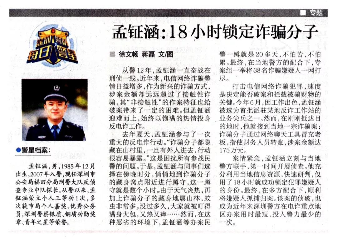 案情緊急,孟鉦涵立刻與當(dāng)?shù)鼐铰?lián)手,第一時(shí)間開展偵查。他充分利用當(dāng)?shù)匦畔①Y源,快速研判,僅用了18小時(shí)就成功鎖定犯罪嫌疑人的身份。最終,在多方配合下,順利將嫌疑人抓捕歸案。該案的偵破,也成為近年來深圳警方在電詐重點(diǎn)地區(qū)辦案用時(shí)最短、投入警力最少的一次。