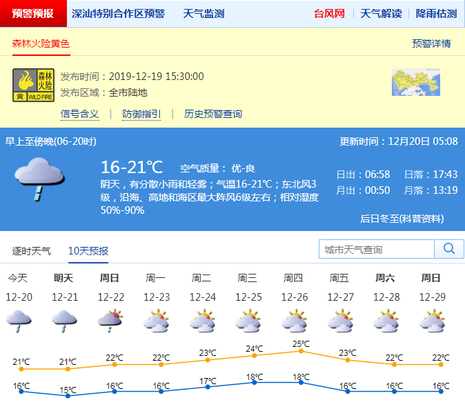 見圳客戶端·深圳新聞網(wǎng)2019年12月20日訊 從18日夜間到19日下午,我市陰天,早晚有輕霧和分散小雨,白天最高氣溫介于20-23℃之間。森林火險紅色預(yù)警信號已降級為黃色。