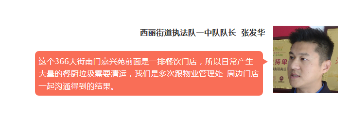 西麗執(zhí)法隊方面表示,無論是蔡某國自稱執(zhí)法隊工作人員,還是被投訴對象直接上門找市民,這樣的行為都明顯不符合規(guī)范。另外,對于市民投訴環(huán)境衛(wèi)生的問題,他們也正在想辦法進行改進,并同時征詢附近商戶居民和物管的意見。
