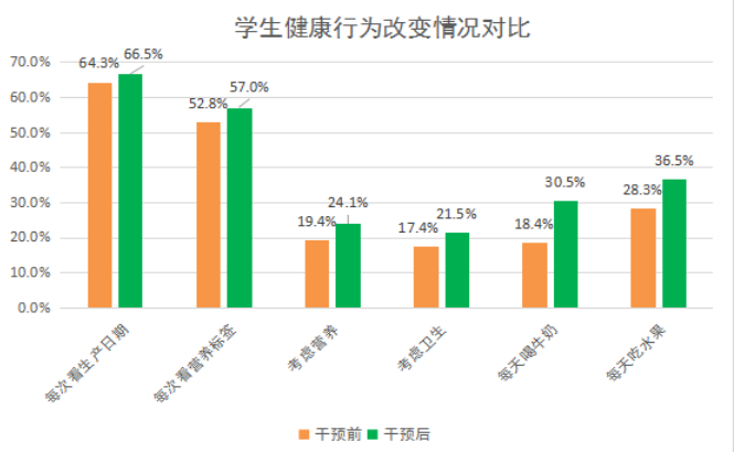 通過1學年的營養(yǎng)教育活動,評估發(fā)現(xiàn),學生選擇經(jīng)常吃的零食中,水果類排名第一,占69.6%;糖果類由26.6%明顯下降至19.9%,降幅25%。經(jīng)常喝的飲料依次是白開水、純牛奶酸奶、果汁和碳酸飲料,干預(yù)后白開水和牛奶比例分別提升至83.4%和76.7%,升幅均超過10%;果汁和碳酸飲料分別降低至38.9%和17.3%,尤其是碳酸飲料降幅超過了30%。每天喝牛奶的比例明顯提升至30.5%,升幅65.8%;每天吃水果的比例提升至36.5%,升幅達到36.5%。每天吃早餐的比例由67.8%上升至74%。