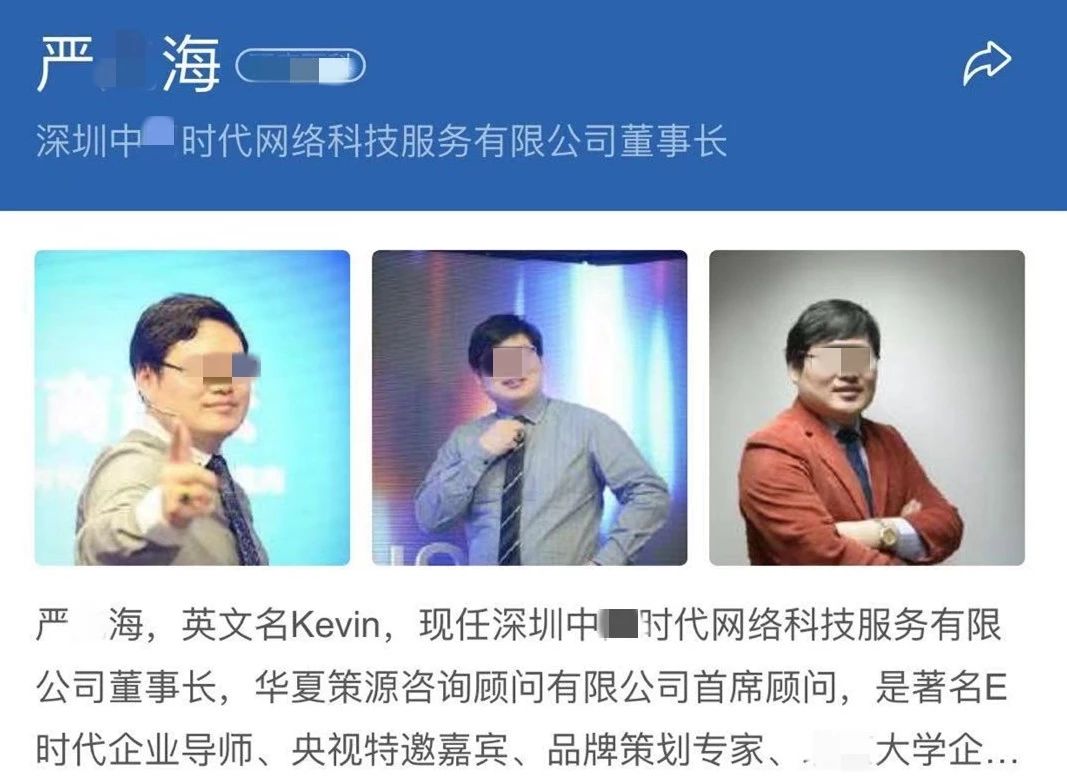 據(jù)介紹,董事長(zhǎng)“嚴(yán)某?!睂?duì)外宣傳資料顯示:著名E時(shí)代企業(yè)導(dǎo)師、品牌策劃專家、某知名大學(xué)企業(yè)轉(zhuǎn)型升級(jí)總裁班實(shí)踐導(dǎo)師,擔(dān)任過多家知名企業(yè)的顧問。據(jù)被抓獲的團(tuán)伙成員交代,嚴(yán)某海自稱擁有雙碩士學(xué)歷,是香港大學(xué)學(xué)者,還是牛津大學(xué)博士。