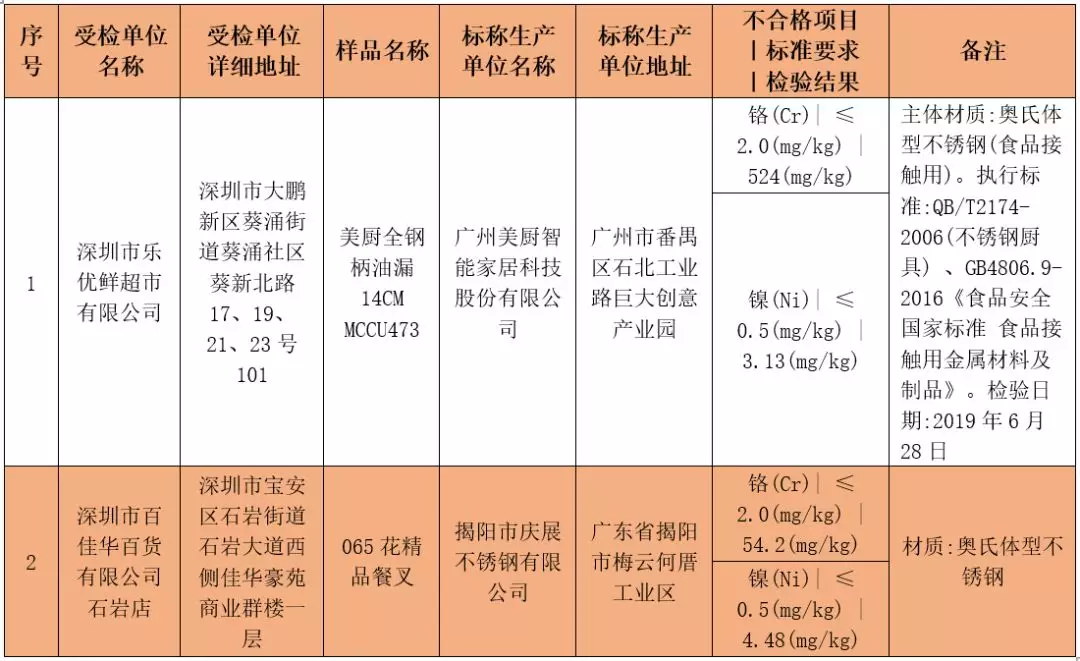 不合格項目均為:鎳(Ni)、鉻(Cr)