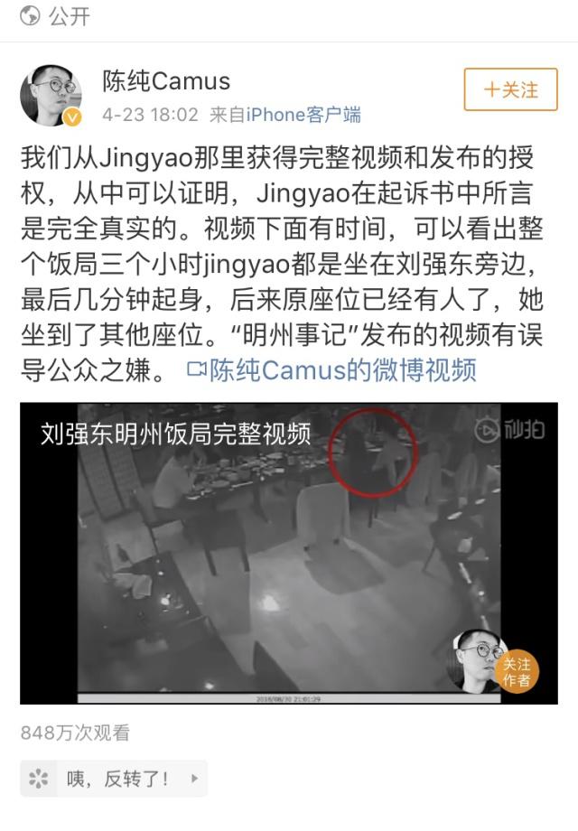 4月23日,微博賬號“陳純Camus”對劉強東飯局發(fā)布視頻,圖為頁面截圖。