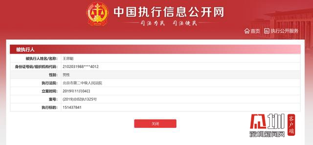 中國執(zhí)行信息公開網上發(fā)布的被執(zhí)行人王思聰信息頁面截圖。
