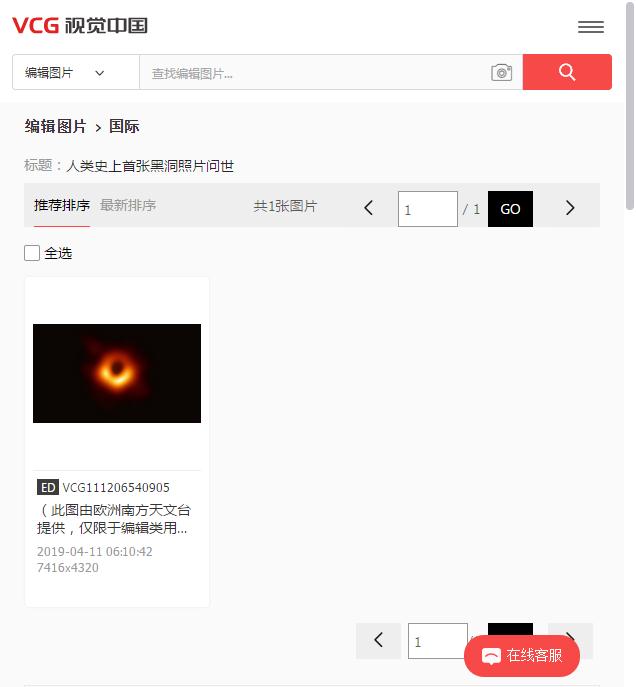這就是網上爆出的視覺中國圖庫里里收錄的黑洞照片的頁面截圖。