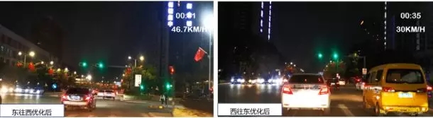 優(yōu)化后,東往西平均車速穩(wěn)定在43.7KM/H,西往東平均車速穩(wěn)定于30.5KM/H,且雙向均可不停車通過各路口,有效將路口車速控制于50KM/H以內(nèi),保證路段駕駛體驗的同時提升了路段安全性。