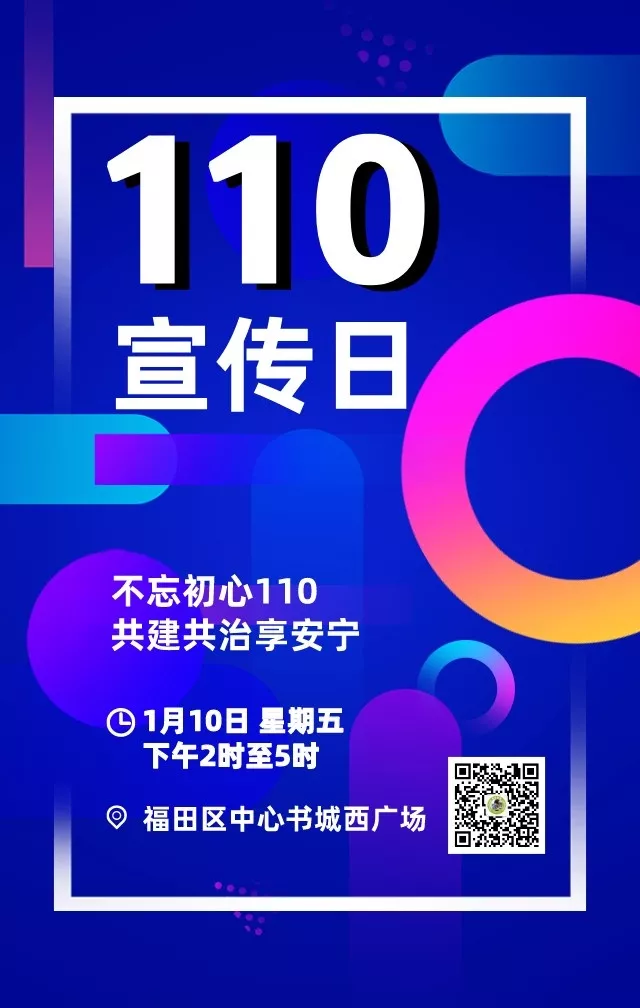 “110宣傳日”來啦!1月10日下午2時至5時,福田區(qū)中心書城西廣場將作為“110宣傳日”主會場,本次活動主題是“不忘初心110,共建共治享安寧”。
