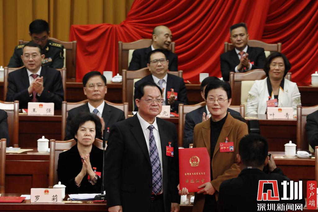 深圳市人大常委會(huì)主任駱文智(左)為新當(dāng)選的市人大常委會(huì)副主任裴蕾(右)頒發(fā)當(dāng)選證書。