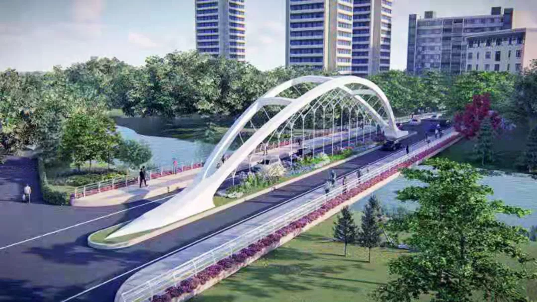 據(jù)介紹,凌菊路跨大沙河橋主體結(jié)構(gòu)需與大沙河生態(tài)長(zhǎng)廊同步建設(shè),項(xiàng)目工期緊、任務(wù)重。根據(jù)相關(guān)規(guī)定,橋梁在河中不能設(shè)支墩,與大沙河河道需滿足2.5m的凈高要求,橋梁跨度大。最終,該項(xiàng)目采用下承式拱結(jié)構(gòu)鋼橋,鋼結(jié)構(gòu)橋梁可在工廠提前預(yù)制,運(yùn)輸至現(xiàn)場(chǎng)安裝,解決了技術(shù)和工期緊等難題。