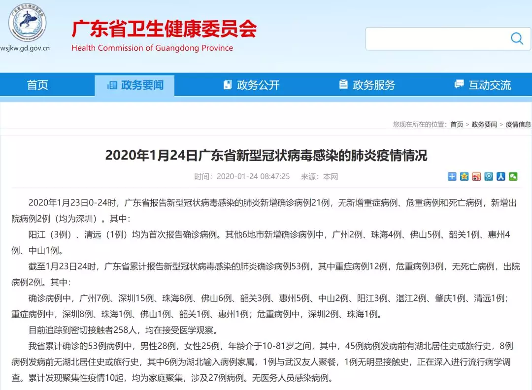 截至1月23日24時(shí),廣東省累計(jì)報(bào)告新型冠狀病毒感染的肺炎確診病例53例,其中重癥病例12例,危重病例3例,無(wú)死亡病例,出院病例2例。其中: