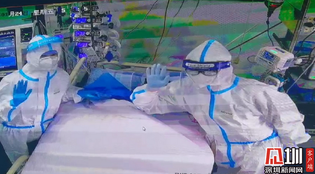 市三院醫(yī)護人員在感染ICU和大家打招呼,感謝市民朋友的關(guān)心和愛護。