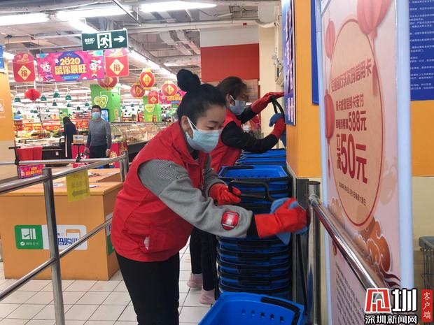見圳客戶端·深圳新聞網(wǎng)2020年1月31日訊(見圳客戶端、深圳新聞網(wǎng)記者 胡津瑋)戴上口罩、手套,再穿上標(biāo)志性的紅色馬甲,市食藥志愿服務(wù)總隊(duì)的志愿者們紛紛走上超市的各個(gè)崗位,清理貨品、補(bǔ)貨、對購物車購物籃進(jìn)行清潔消毒、為來購物的市民測量體溫…據(jù)了解,由于春節(jié)期間各大商超缺少人手,在市市場監(jiān)管局與團(tuán)市委的指導(dǎo)下,市食藥志愿服務(wù)總隊(duì)迅速調(diào)動(dòng)全市在深的食品藥品安全志愿者,成立了由近300名食品藥品安全志愿者組成的春節(jié)“菜籃子”志愿者保障工作小組,為全市各大商超提供志愿服務(wù),全力保障市場供應(yīng)、消除市民顧慮,在防控疫情特殊期間注入了紅馬甲的正能量。記者今天便走訪了深圳的一家超市,尋找這批紅色的身影,了解他們一天的工作。