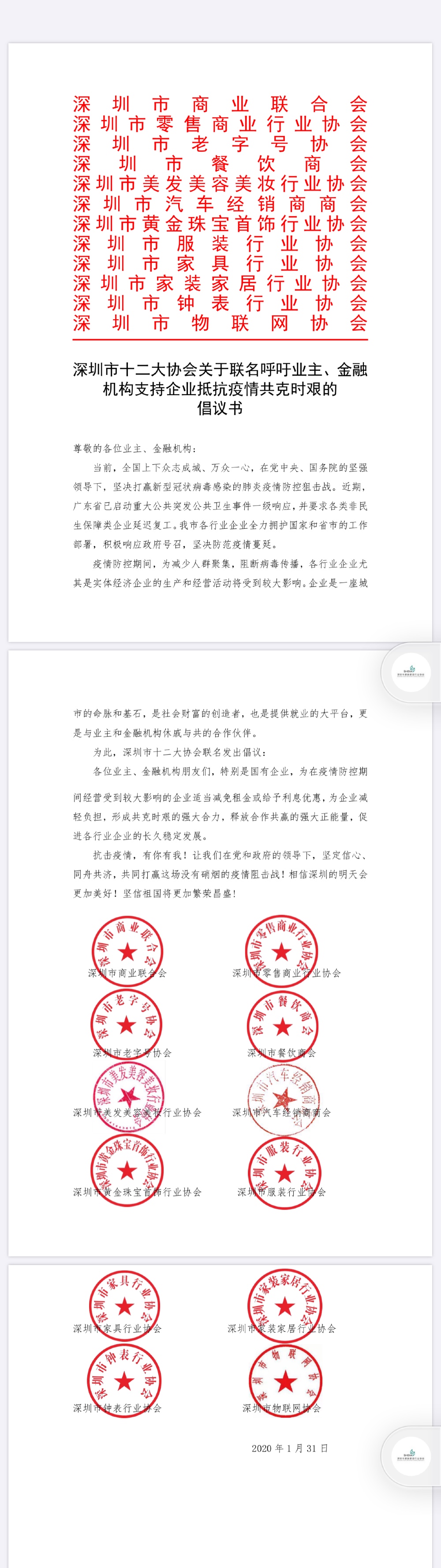 見(jiàn)圳客戶端·深圳新聞網(wǎng)2020年2月1日訊(見(jiàn)圳客戶端、深圳新聞網(wǎng)記者 金洪竹)1月31日深夜,一份特別的倡議書(shū)在網(wǎng)絡(luò)熱傳。深圳市商業(yè)聯(lián)合會(huì)、深圳市零售商業(yè)行業(yè)協(xié)會(huì)、深圳老字號(hào)協(xié)會(huì)、深圳市餐飲商會(huì)、深圳市美發(fā)美容美妝行業(yè)協(xié)會(huì)、深圳市汽車經(jīng)銷商協(xié)會(huì)、深圳市黃金珠寶首飾行業(yè)協(xié)會(huì)、深圳市服裝行業(yè)協(xié)會(huì)、深圳市家具行業(yè)協(xié)會(huì)、深圳市家裝家居行業(yè)協(xié)會(huì)、深圳市鐘表行業(yè)協(xié)會(huì)和深圳市物聯(lián)網(wǎng)協(xié)會(huì)等12家商協(xié)會(huì)發(fā)出聯(lián)名倡議,呼吁業(yè)主、金融機(jī)構(gòu)支持企業(yè)抵抗疫情、共克時(shí)艱。