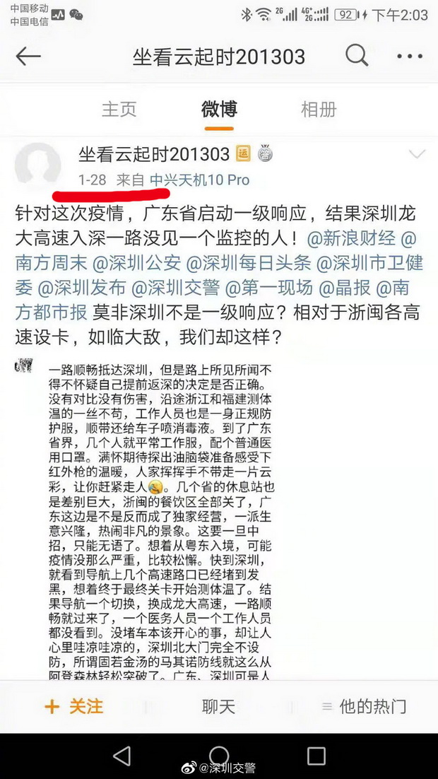 1月28日,有網(wǎng)友在社交軟件上稱(chēng)深圳“不設(shè)防”,龍大高速無(wú)檢疫點(diǎn)。