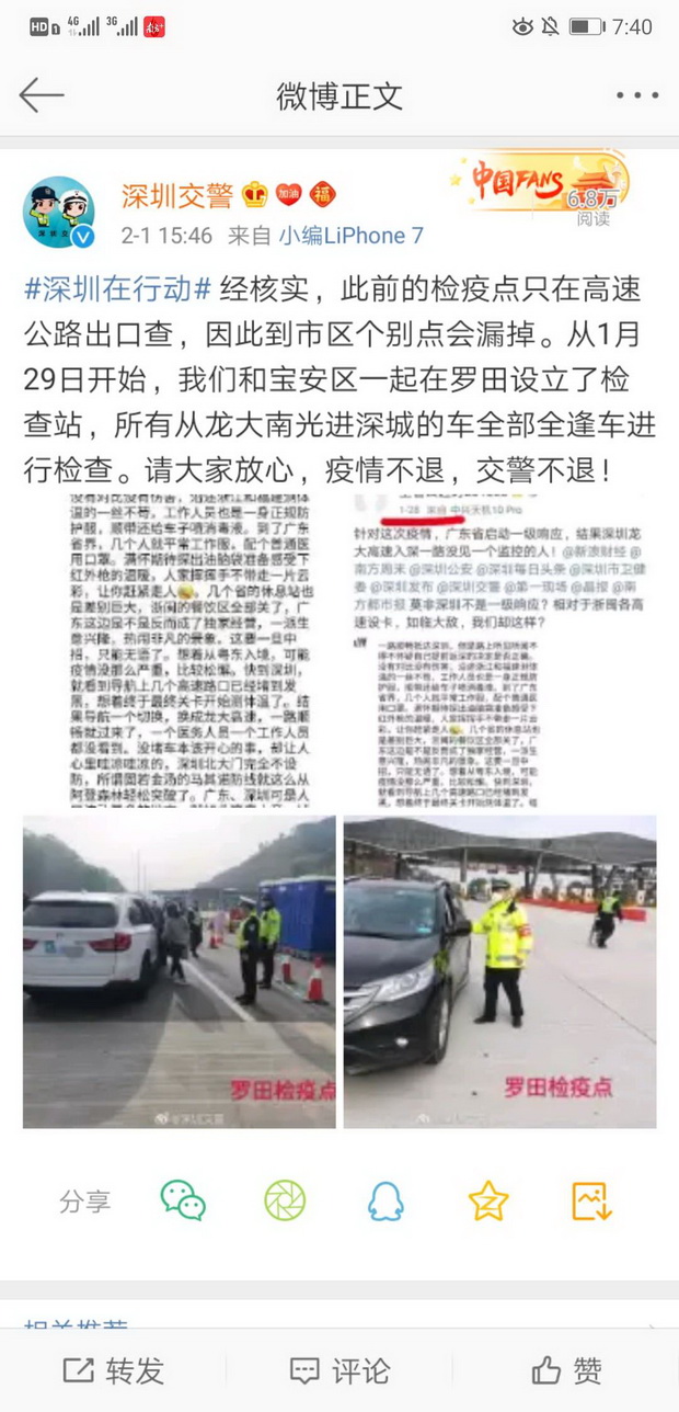 2月1日下午,深圳交警在其官方微博上表示,經(jīng)核實(shí),此前的檢疫點(diǎn)只在高速公路出口查,因此到市區(qū)個(gè)別點(diǎn)會(huì)漏掉。從1月29日開(kāi)始,深圳交警和寶安區(qū)一起在羅田設(shè)立了檢查站,所有從龍大南光進(jìn)深城的車(chē)全部全逢車(chē)進(jìn)行檢查。請(qǐng)大家放心,疫情不退,交警不退。
