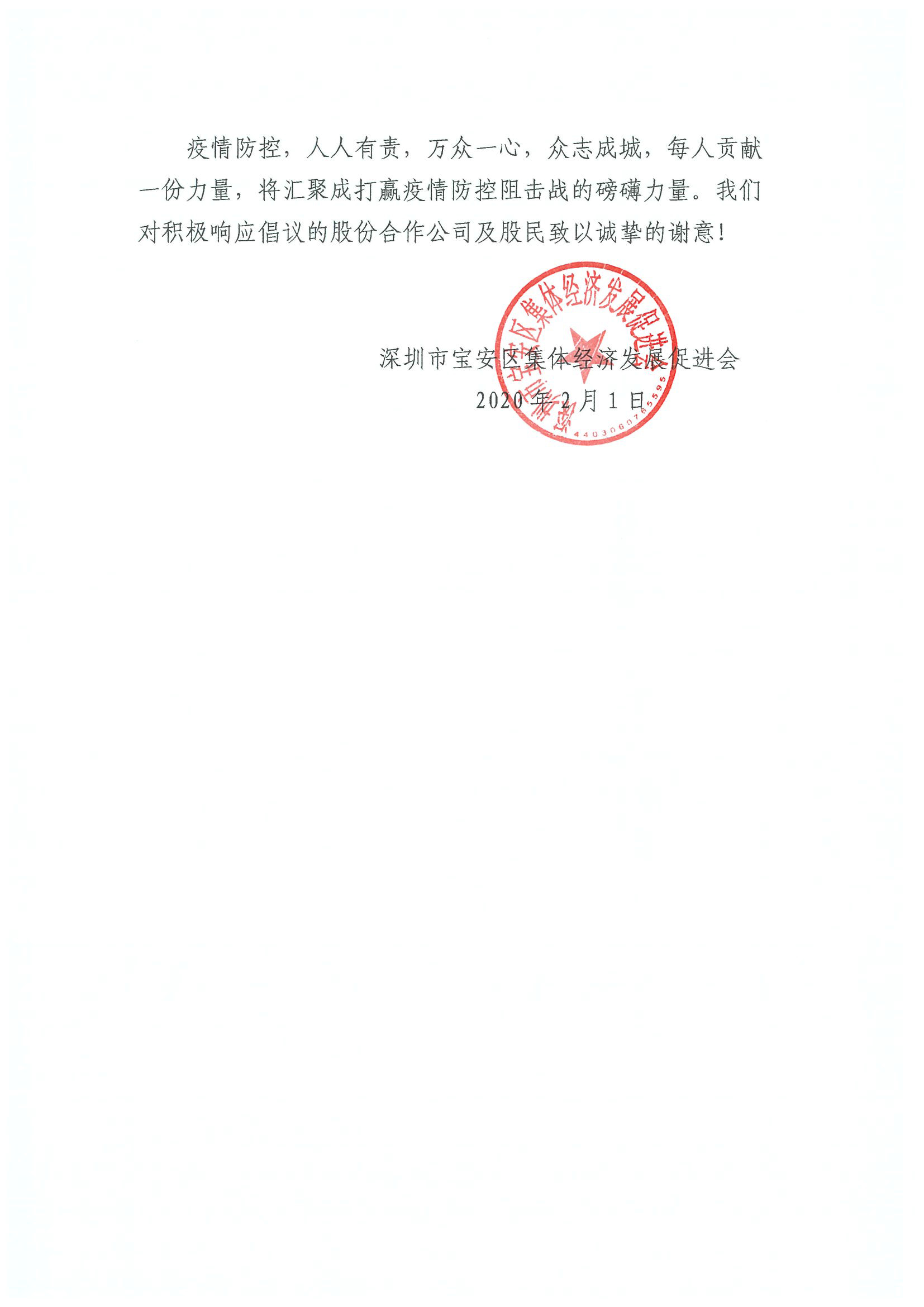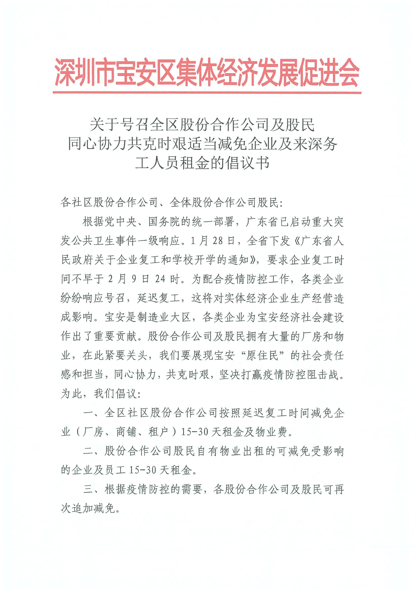 深圳新聞網(wǎng)寶安訊 “疫情防控,人人有責(zé),萬眾一心,眾志成城,每人貢獻(xiàn)一份力量,將匯聚成打贏疫情防控阻擊戰(zhàn)的磅礴力量?!?月1日晚,寶安區(qū)集體資產(chǎn)管理局指導(dǎo)寶安區(qū)集體經(jīng)濟(jì)發(fā)展促進(jìn)會向?qū)毎矃^(qū)各社區(qū)股份合作公司、全體股份合作公司股民發(fā)出《同心協(xié)力共克時艱適當(dāng)減免企業(yè)及來深務(wù)工人員租金的倡議書》,號召全區(qū)股份合作公司及股民適當(dāng)減免企業(yè)及來深務(wù)工人員15-30天租金及物業(yè)費(fèi),并根據(jù)疫情防控的需要可再次追加減免。