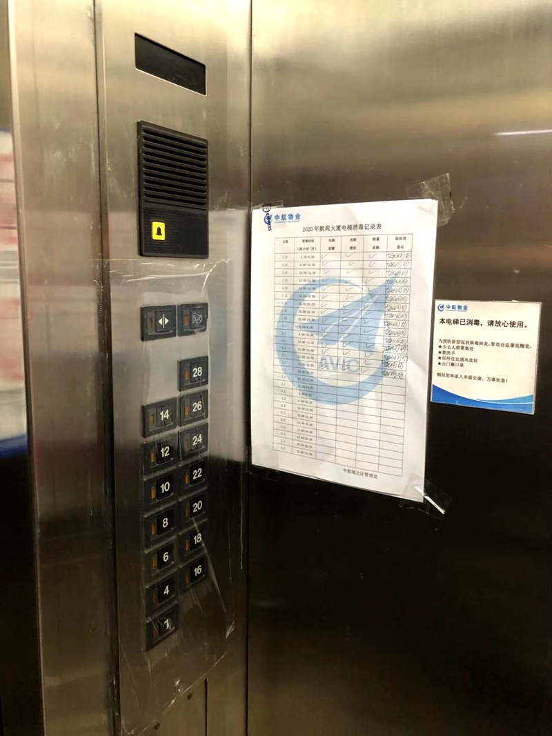 在小區(qū)走廊張貼著多張防疫宣傳海報(bào),大廳的電視上持續(xù)播放防疫工作相關(guān)科普知識(shí)。在電梯間記者看到,按鍵都已經(jīng)貼上了一次性塑料膜,旁邊張貼著《2020年航苑大廈電梯消毒記錄表》。