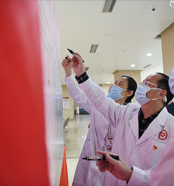 在整個(gè)疫情阻擊戰(zhàn)中,龍崗區(qū)婦幼保健院黨組織自始至終都發(fā)揮著不可替代的先鋒模范作用,在疫情剛開始的時(shí)候,以曹樂勝院長為首的醫(yī)院黨委就身先士卒緊急行動(dòng)起來迅速投入到抗病毒戰(zhàn)斗中去。院黨委發(fā)出了通知,號(hào)召廣大員工積極行動(dòng)起來,投身疫情防控第一線,全院人員迅速響應(yīng),截止2月3日,報(bào)名人數(shù)達(dá)369人,其中黨員112人。醫(yī)院組織了部分代表參加的宣誓儀式,大家激情滿懷地舉起右手,莊嚴(yán)承諾:我將堅(jiān)守初心,勇?lián)姑粺o條件服從大局,時(shí)刻準(zhǔn)備著聽候組織調(diào)令;立志沖鋒在前,誓到防疫第一線;我必履職盡責(zé),嚴(yán)守規(guī)范,防護(hù)到位,確保零感染;保證與病毒戰(zhàn)斗到底,不打贏這場(chǎng)硬仗絕不收兵。
