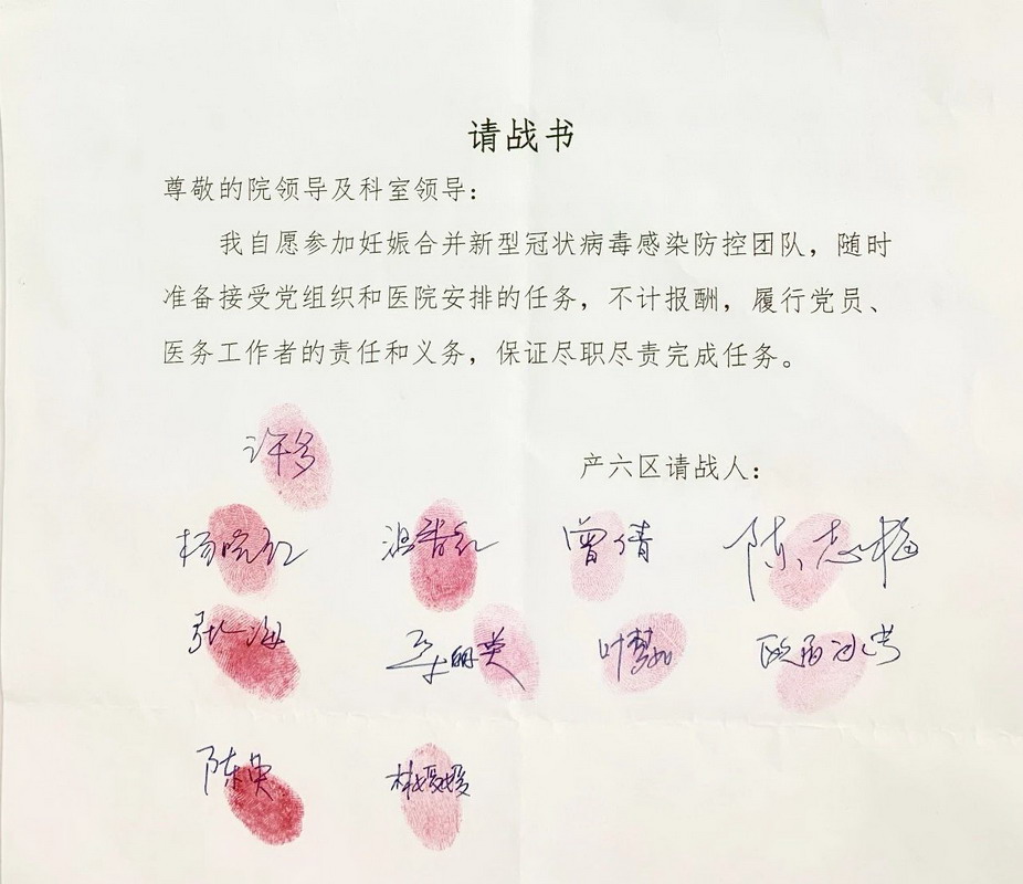 面對(duì)疫情,黨員干部紛紛向科室提交請(qǐng)戰(zhàn)書并莊嚴(yán)宣誓,志愿參加疫情防控的阻擊戰(zhàn)。產(chǎn)科共收到200多份請(qǐng)戰(zhàn)書,特別是有三名孕婦請(qǐng)纓,令人動(dòng)容。請(qǐng)戰(zhàn)人員組成了三個(gè)防控梯隊(duì),為醫(yī)院妊娠合并新型冠狀病毒感染防控奠定了強(qiáng)大的人力資源保障。