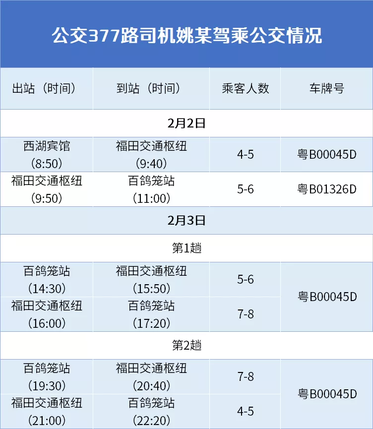 2月2日上午,姚某到車隊報到,按照公司疫情防控工作規(guī)定,經(jīng)體溫檢測正常后,車隊安排姚某隨377路跟班一趟(先后搭乘2臺車,分別是粵B00045D、8時50-9時40分、粵B01326D、9時50-11時)共約2小時,期間先后同車乘坐乘客11名。車載視頻顯示,姚某多數(shù)時間坐在公交車中后部,并佩戴口罩。