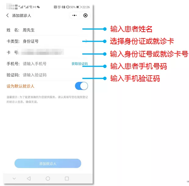 患者首次進(jìn)入診室,需添加就診人,輸入在醫(yī)院的就診信息,綁定身份。