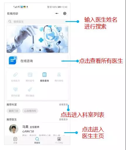 方式一:通過(guò)“找醫(yī)生”界面查找醫(yī)生,發(fā)起問(wèn)診咨詢: