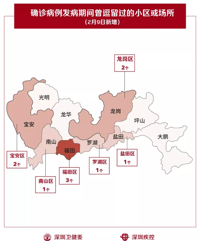 2月9日,疾控專業(yè)人員通過最新的流行病學(xué)調(diào)查確認(rèn),深圳新增10個小區(qū)(場所),有新確診的病人在出現(xiàn)病征期間曾經(jīng)逗留。