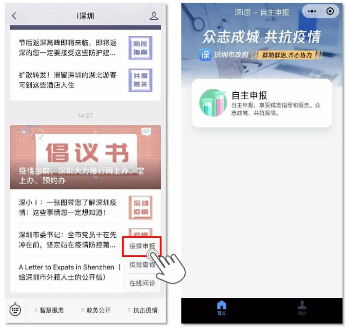 3、“i深圳”APP:通過“i深圳”APP疫情防控服務(wù)專區(qū)入口,進(jìn)入申報(bào)平臺(tái)。