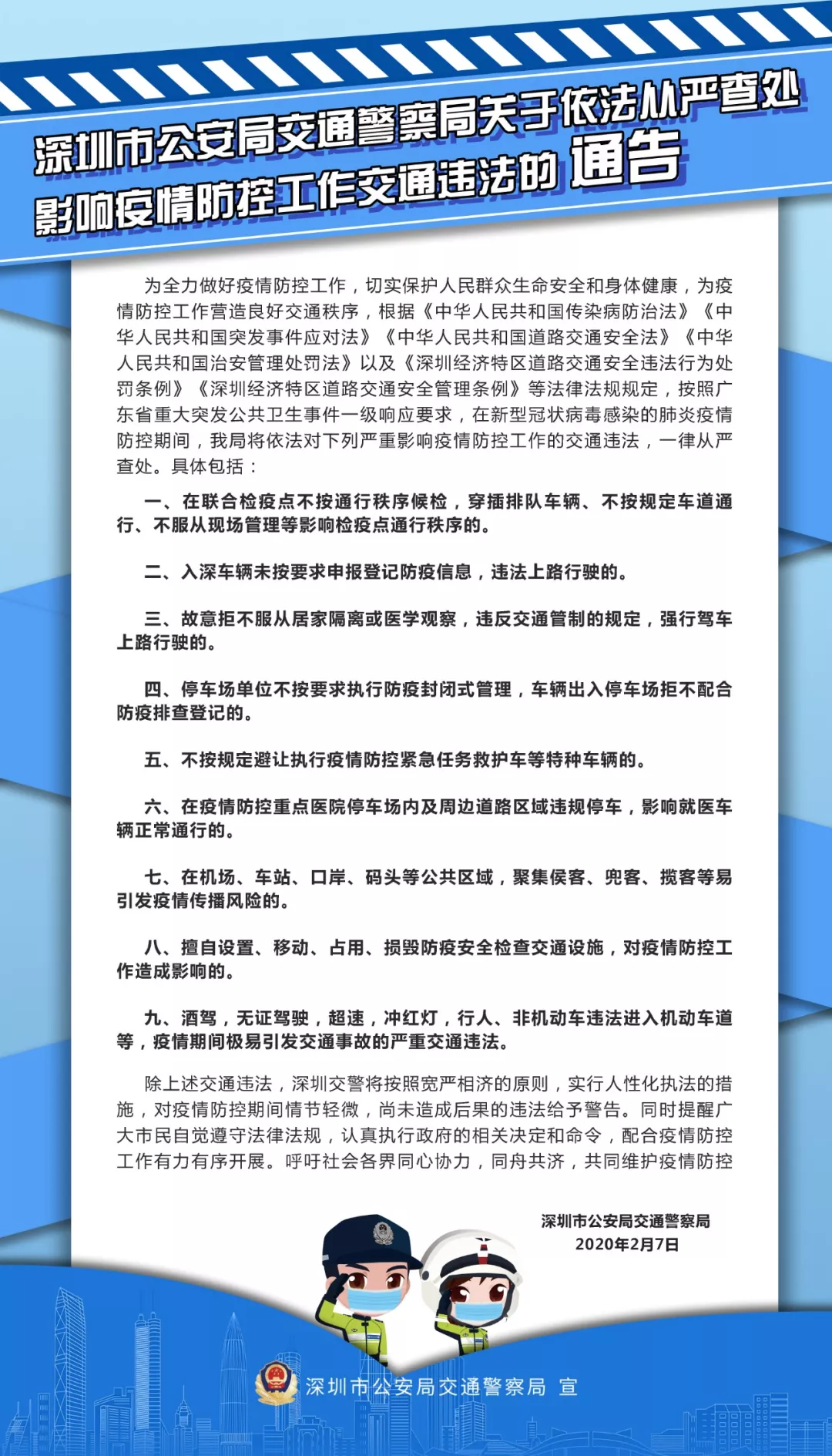 深圳市公安局交通警察局關(guān)于依法從嚴(yán)查處影響疫情防控工作交通違法的通告
